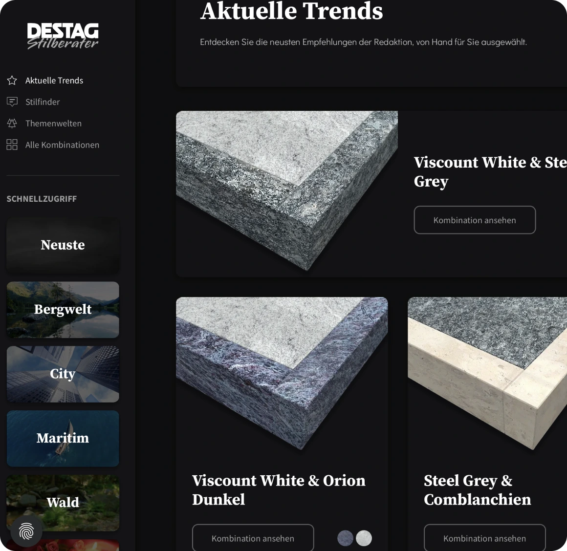 Aus Liebe zu unserer Arbeit treiben wir täglich Innovation in unserer Branche voran. Daher entwickeln wir stetig neue analoge und digitale Werkzeuge, die Sie in Ihrem Tagesgeschäft unterstützen. Erleben Sie ein einmaliges Beratungserlebnis mit unserem virtuellen Stilberater und unserem Online-3D-Konfigurator. Nutzen Sie unseren Lagerware-Onlineshop für mehr Komfort bei der Warenbeschaffung und vereinfachen Sie Ihre Bürokratie mit unserem Händlerportal zur digitalen Lieferverfolgung und dem direkten Download von Rechnungen.